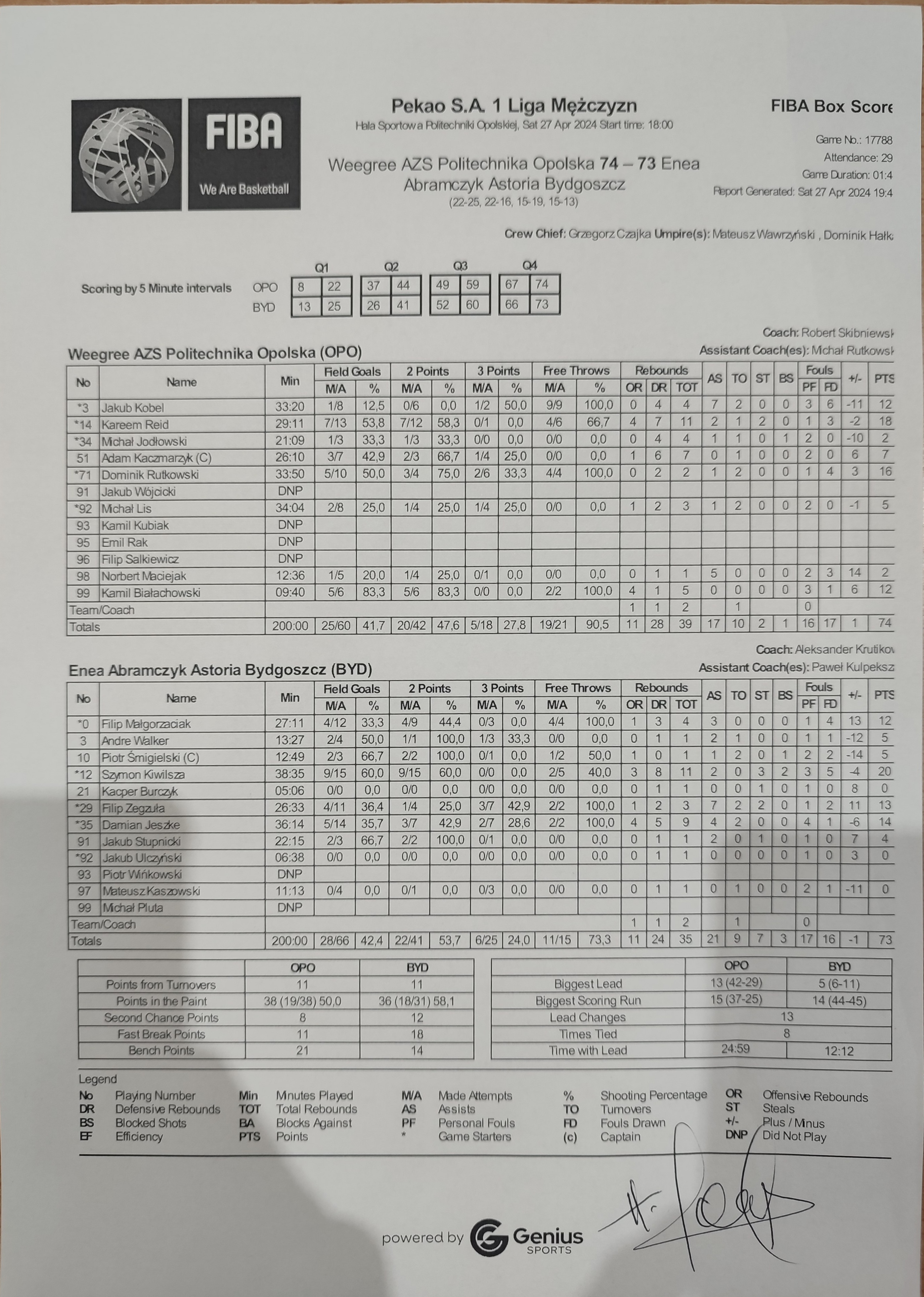 | 99 | Kamil Białachowski | 12 | 09:40 | 5/6 | 83.3 |   |   | 5/6 | 83.3 | 2/2 | 100.0 | 4 | 1 | 5 |   | 3 | 1 |   |   |   |   | 16 | 6 | |